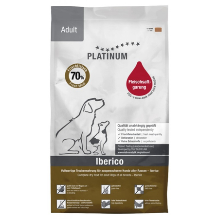 PLATINUM Adult Iberico to pełnoporcjowa, naturalna karma sucha dla dorosłych psów, przygotowana z 70% świeżej wieprzowiny iberyjskiej – wyjątkowego mięsa o wysokiej wartości odżywczej i doskonałym smaku. Dzięki delikatnemu procesowi gotowania we własnym sosie karma zachowuje naturalne aromaty i składniki odżywcze, zapewniając Twojemu psu zdrowy posiłek, który zaspokoi nawet najbardziej wybredny apetyt.